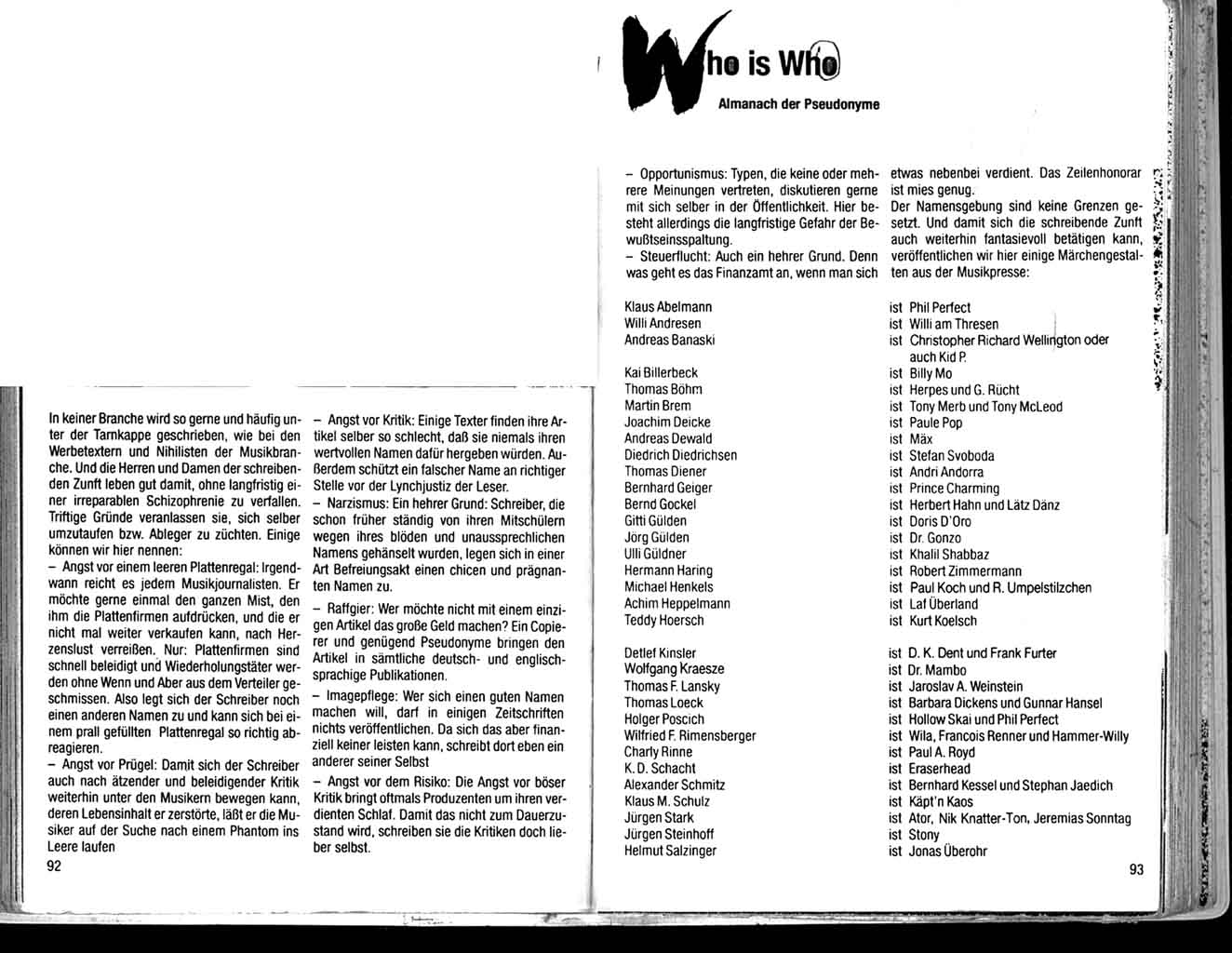 Aus dem "Rockkalender" 1986: Who is Who, Almanach der Pseudonyme